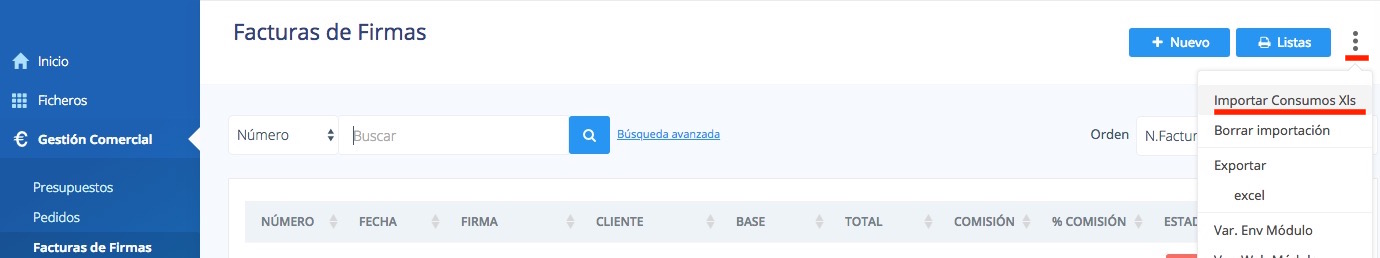 Si además de registrar las facturas quieres controlar el estado de liquidación de cada una de ellas y generar la factura de comisión hacia la firma, debes proceder a realizar el proceso de liquidación desde el menú "Gestión Comercial / Liquidación de comisiones"