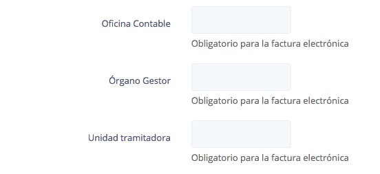 2.- En la ficha de los clientes, solapa facturación debes informar la "Oficina Contable", "Órgano Gestor" y "Unidad tramitadora". Estos datos te los debe proporcionar el cliente.
